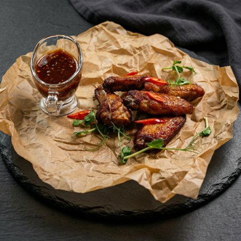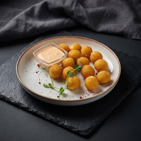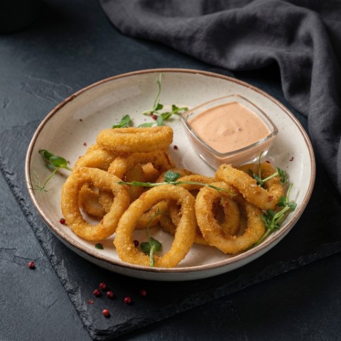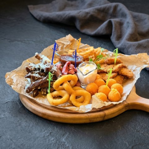 Кольца кальмара, сырные шарики, чесночные гренки, чикен чипс, колбаски охотничьи, луковые кольца, подается с соусом BBQ и соусом сладкий чили