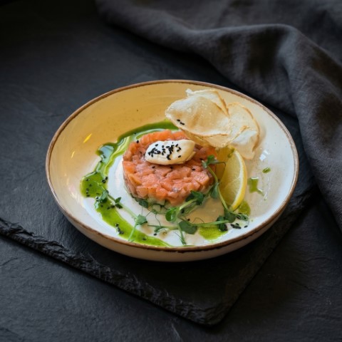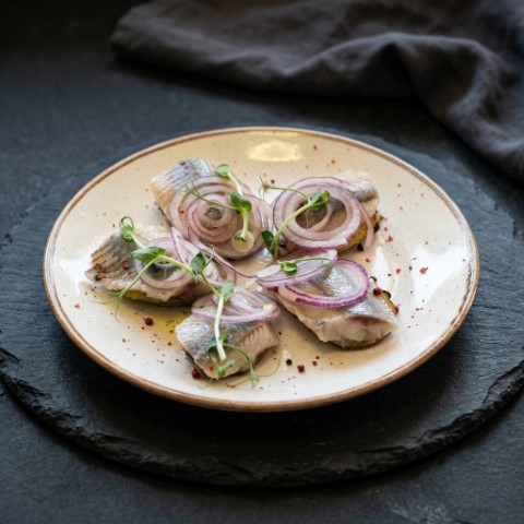 Филе пеламиды с тостами из чёрного хлеба, красный лук, соус из оливкового масла и бальзамического уксуса.