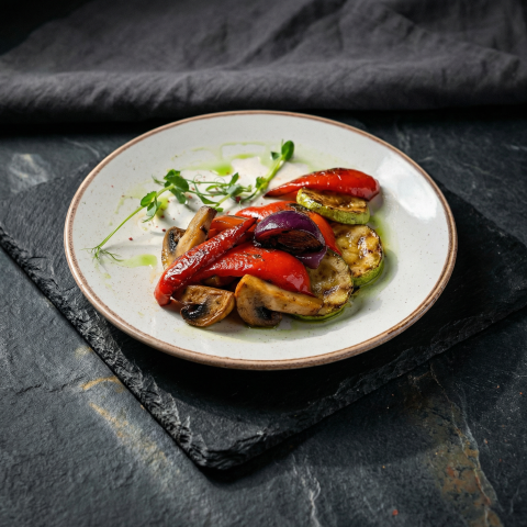 Цукини, помидор, шампиньоны, перец болгарский, лук красный