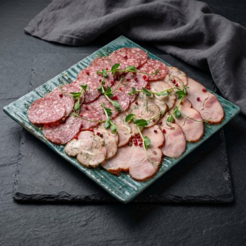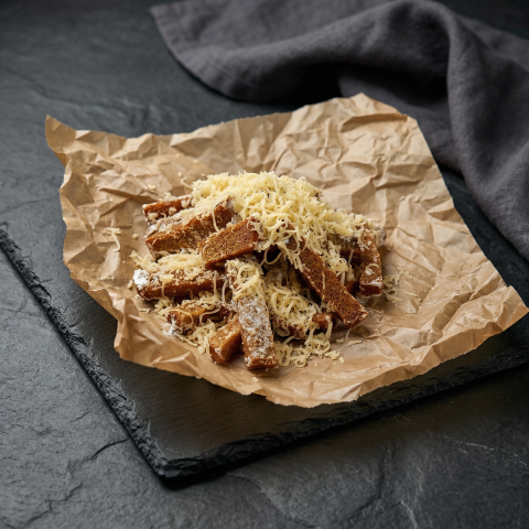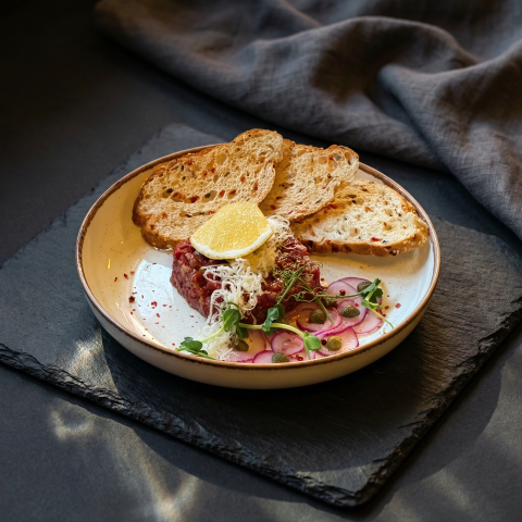 Говядина, каперсы, лук красный, огурец маринованный, горчица зерновая, лимон, багет мультизерновой, пармезан