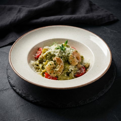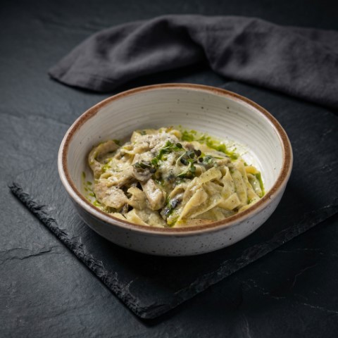 Паста с куриным филе, шампиньонами в сливочном соусе с добавлением песто