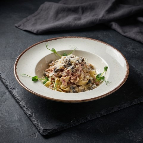 Феттучини с ветчиной и грибами
