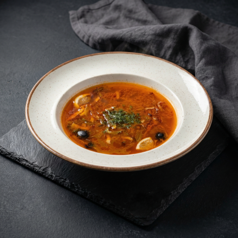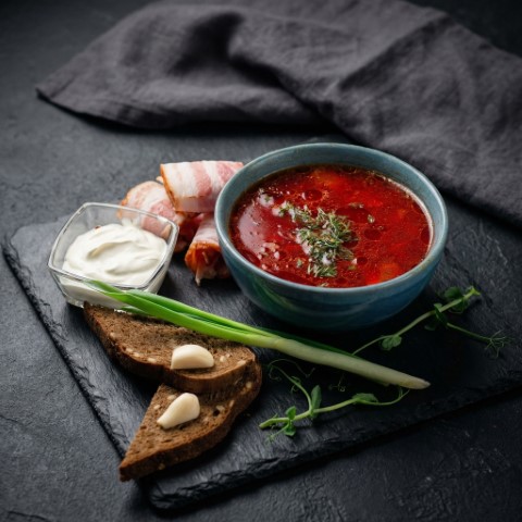 С комплиментом от Шефа с фермерской говядиной. Подается с салом, гренками из черного хлеба, чесноком, зеленым луком и сметаной