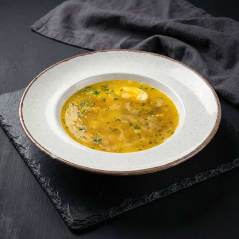 Бульон куриный, лапша, лук, морковь, зелень, яйцо
