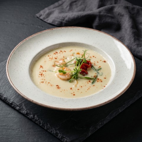 Картофель, лук, креветки, кальмар, судак, сливки, помидоры черри, зелень